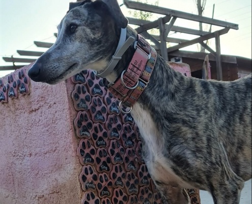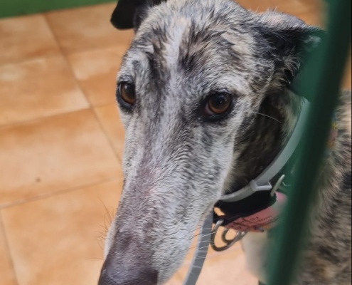 A galgo who has most likely had a the rub of a fence to run up and down and call attention to himself to make himself known.. harsh and stand offish he makes himself. And this energy is far less than peaceful and an energy he really doesn’t need to have. This job he has to loosen his guard and know there’s no need to take this on anymore. To teach this is tricky for being careful and clear is paramount but the main objective is he learns to let go and allow a peace within to reign.