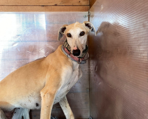 She prances and dances. Interacts with the other galgos and is very sweet. You have to earn her trust. But when you do WoW what a beautiful soul she is.