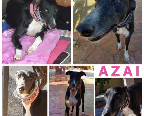Este chico es increible. Sin embargo, necesita un hogar experimentado y otro galgo con quien jugar u amigo canino. Es negativo en enfermedades y aún puede ser tímido, pero se desarrollará maravillosamente en un hogar. Azai llegó a la Finca en marzo de 2019, junto con su mamá y hermana Azaria que ya ha sido adoptada.
