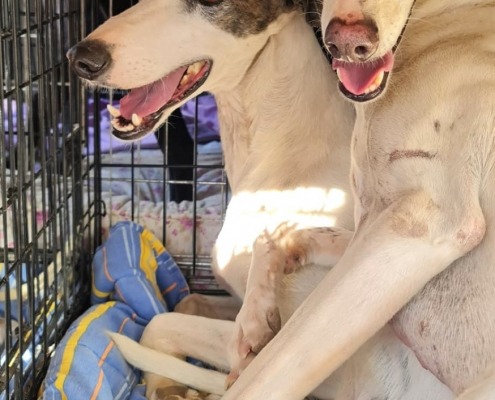 Presentamos a Eshin (Galgo blanco)… este nombre significa comprensión de la mente y Sabiduría. Mientras este galgo está cegado por la confusión en este momento, verá la luz y sabrá que toda la sabiduría que usó para mantenerse con vida estará con el y comprenderá por qué tiene una nueva vida.